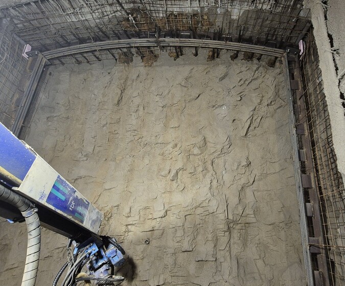 Další dobrou zprávou je, že podle platného časového plánu dále úspěšně pokračuje realizace úseku Pankrác–Olbrachtova. Vlastní provádění ražeb se zde proto nezadržitelně blíží do svého finále. Jedním z míst, kde ještě aktivně ražby probíhají, je stanice Pankrác, kde k 31. 1. 2026 zbývá vyrazit ve středním dílčím výrubu 38 m, ve vrchní části jádra 66 m, ve spodní části jádra 113 m, a to vždy z celkové 130 m délky ražené stanice (obr. 2). Druhým a současně posledním aktivním pracovištěm z pohledu ražeb jsou přestupní chodby – Arkády, kde zbývá vyrazit ještě cca 80 % z celkového objemu (obr. 3). V ostatních částech realizovaného úseku probíhají po dokončených ražbách a izolacích již pouze betonáže definitivního ostění (obr. 4).