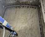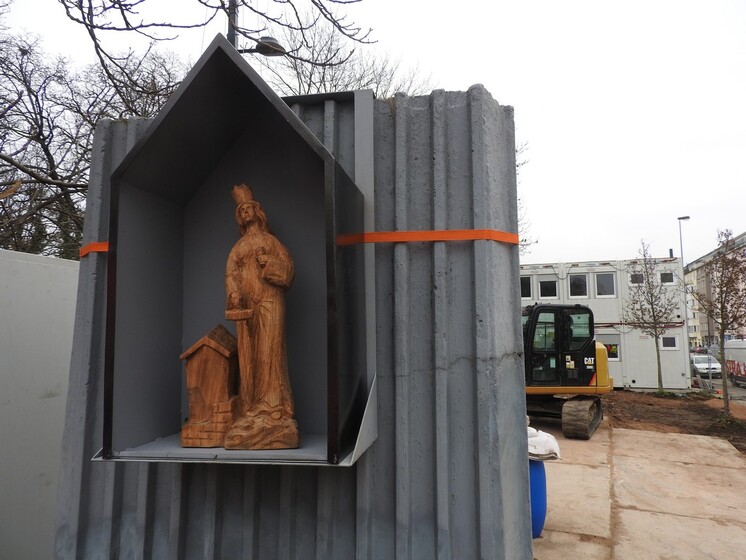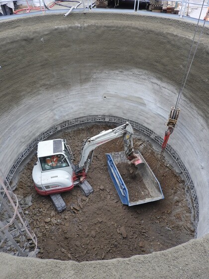 V době osazení dřevěné sošky sv. Barbory (obr. 8) byly kromě hutněného násypu, který je zajištěn záporovou stěnou od hřbitova, a zpevnění staveništních ploch provedeny práce na šachtě, která je tvořena mikropilotami vyvrtanými do zvětralého skalního podloží se železobetonovým ohlubňovým věncem a šachta tak byla připravena na hloubení.