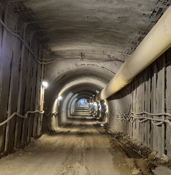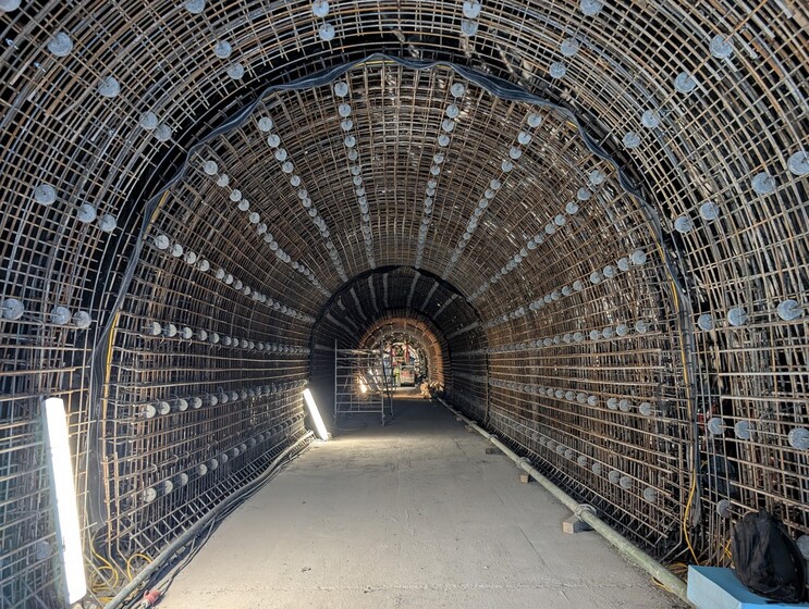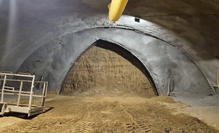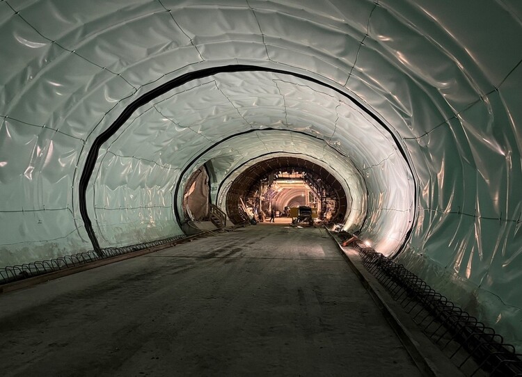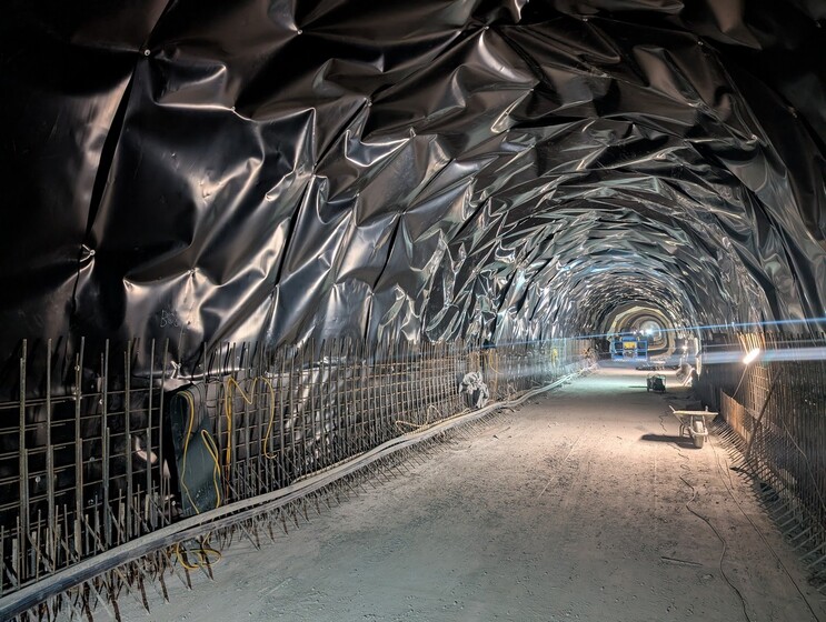 Dne 24. února 2026 byl na kolektoru Hangár G raženým podle letištěm Václava Havla v Praze vybetonován poslední blok betonáže sekundárního ostění. Tím úspěšně skončila výstavba hlavních nosných konstrukcí ražené části kolektoru, který pro investora Letiště Praha a.s. podle realizační dokumentace firmy SAGASTA prováděla v subdodávce pro firmu Metrostav DIZ firma Pohl CZ. Kolektor celkové délky 298 m byl ražený ve dvou úsecích mezi šachtami TK7, Š08 a Š09 pomocí NRTM s dvouplášťovým ostěním. Betonáž sekundárního ostění probíhala do deformačně ustáleného primárního ostění ze stříkaného betonu vyztuženého ocelovými sítěmi a příhradovými rámy. Výztuž byla prováděna standardně jako samonosná (obr. 13). Pro zajištění vodotěsnosti kolektoru byl použit systém kombinující sekundární ostění z vodotěsného betonu s těsněním pracovních spár pomocí vnitřních těsnicích pásů s pojistným systémem umožňujícím v případě netěsností dodatečnou injektáž vnitřních těsnicích pásů. Pro zamezení přenosu smykových napětí mezi primárním a sekundárním ostěním byla použita separační fólie (obr. 14). Sekundární ostění minimální tloušťky 300 mm bylo betonováno po sekcích délky 10 m. Mezi šachtami TK7 a S8 bylo vybetonováno celkem 18 bloků betonáže, v úseku mezi šachtami Š8 a Š9 celkem 12 bloků betonáže. V napojení na šachty měly bloky betonáže atypickou délku.