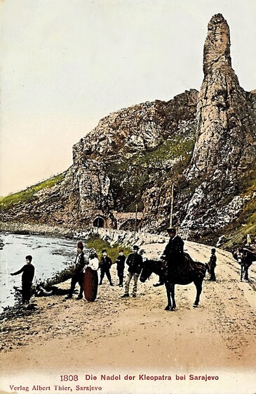 Obr. 1 1808 Kleopatřina jehla (něm. Nadel der Kleopatra) u Sarajeva. Kolorovaná fotografie. Verlag Albert Thier, Sarajevo. 1897 [sbírka autorů]. Kaňon Dariva v Sarajevu zahajuje vysoké vápencové bradlo. Skalní věž, známou Bosňanům jako Babin zub, pojmenovali zde usazení Rakušané „Kleopatřina jehla“. Měla svým tvarem připomínat staroegyptské obelisky. V pozadí je vidět východní portál krátkého přístupového „Starého rakouského tunelu“.