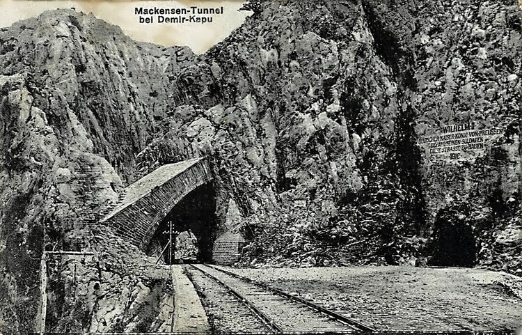 Demirkapijská soutěska měla za 1. světové války zásadní roli v logistice Soluňské fronty. Pro posílení stávající železnice byla proto přes masív zřízená lanovka. Když nepostačovala ani ta, byl vyražený silniční tunel. Ten byl pojmenovaný po pruském polním maršálovi Augustu von Mackensenovi (*1849 †1945), veliteli armád Centrálních mocností. Při dokončení tunelu v roce 1916 byl nad vstupem vytesán nápis, víceméně zachovaný: WILHELM II. DEUTSCHER KAISER KÖNIG VON PREUSSEN DEPAHL SEINEN SOLDATEN DIESE STRASSE ZU BAUTEN 1916 (Vilém II., německý císař a král Pruska, nařídil svým vojákům v roce 1916 postavit tuto cestu). Málo se již ví, že po 1. světové válce nechali (vítězní) Francouzi pod tento nápis umístit další, na památku maršála Francie Francheta d'Esperey (*1856 †1942), velitele dohodových vojsk na zdejší frontě: LE GENERAL FRANCHET D´ESPEREY COMANDANT EN CHEF DES ARMÉES ALLIÉES D´ORIENT ORDONNA A SES TROUPES DE CHASSER LES BOCHES 1918 (Generál Franchet d'Esperey, vrchní velitel spojeneckých armád na východě, nařídil v roce 1918 svým jednotkám, aby Němce vyhnaly). Tento nápis však za 2. světové války Němci odstranili.