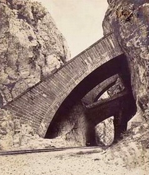Obr. 11 Vstup železnice do soutěsky Demir Kapija [10]. Jde o západní vstup. Tři mohutná žebra vyzděná z kamenných desek mají ochranou, ale patrně i statickou funkci. Vlevo nejsou vidět okna galerie otevřená k řece Vardar.