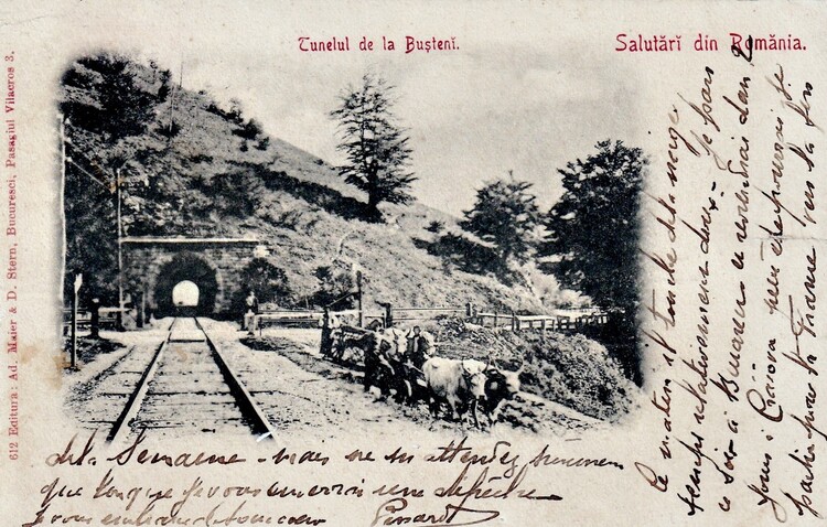 Obr. 12 Pozdrav z Rumunska (Salutări din Romănia). Tunel Busteni (Tunelul de la Buşteni). 612 Editura: Ad. Maier & D. Stern, Bucuresci, Pasagiul Vilacros 3. 1907 [sbírka autorů]. Jižní portál. Skrze krátký tunel v přímé bylo dobře vidět ono „světlo na konci“. Vůz s volským zápřahem je skvělým kontrastem k železnici.