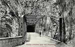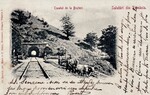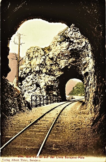 Obr. 4 1784 Jeden z tunelů na trati Sarajevo–Pale. Kolorovaná fotografie. Verlag Albert Thier, Sarajevo.1912 [sbírka autorů]. Na pohlednici je výjezd z jižního portálu tunelu č. 6 do bezprostředně následujícího krátkého tunelu č. 7.
