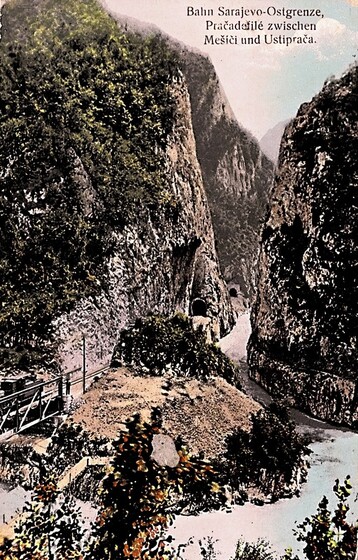 Obr. 3 Železniční trať Sarajevo – Východní hranice: Soutěska Miljacka. Kolorovaná fotografie. C.S. 953. Kunstverlag Cappon, Sarajevo. 1914 [sbírka autorů]. Na pohlednici se nachází v dramatické krasové krajině, s nejvyšší pravděpodobností, vstup železnice do soutěsky řeky Miljacka, severním portálem tunelu č. 5.