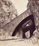 Obr. 10 Mackensenův tunel u Demir-Kapu. ? 1918 [sbírka autorů]. Pohled do soutěsky od západu, řeku Vardar lze tušit zcela vlevo. Tmavá plocha vpravo je původní vstup do Mackensenova silničního tunelu. Konstrukce, do které vedou koleje, je tunelovou galerií. Přístup do starého vojenského tunelu je dnes zaslepený a těsně vlevo od něj se nachází provozovaný tunel (z roku 1964?). Nápis nad vstupem do Mackensenova tunelu překvapivě dochoval.
