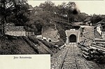 Obr. 9 Tunel Djep. ??. 1900 [sbírka autorů]. Levé úbočí kopce nad tunelem je lom. Nechybí ani cesta pro dopravu kamenů k železniční trati, podél které jsou kamenné prvky také rozloženy. Zajímavá je také drezína na kolejích a v pozadí, v údolí, most.