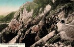 V levé straně pohlednice na obr. 10 se nad železniční tratí nachází zajímavá konstrukce, která však není tunelem, nýbrž jde o neobvyklou tunelovou galerii. Sestávala ze (tří?) mohutných žeber vyzděných z kamenných desek a chránících koleje před padajícími kameny. Lépe než pohlednice na obr. 10 ilustruje originalitu konstrukce obr. 11 mimořádně přejatý z internetu [10]. Pozoruhodná galerie však časem (válečnými událostmi, zemětřesením?) vzala za své. Byla nahrazená nevzhledným (okolo 50 m dlouhým, betonovým?) tunelem.